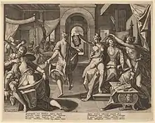 ...reino acerca de ellos fue Sardanápalo, hombre más corrupto y vicioso que mujer ninguna... le hallo sentado entre una muchedumbre de mujeres, mancebas y concubinas suyas hilando lana, de la que se hace la púrpura: con su rueca en la cinta en atavío de mujer, con muy grande afeminación y delicadeza de cuerpo, y lascivia de los ojos en la cual sobrepasaba a todas las mujeres del mundo...y se hubo de retraer a la ciudad en su casa real y por no venir vivo a manos de sus enemigos, mandó hacer en medio de ella una hoguera grande donde se echó a sí y todas sus riquezas: para allí con ellas quemarse: en lo cual solo en toda la vida se mostró ser hombre.[2]