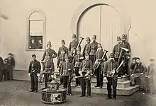 El saxhorno fue el más común de los instrumentos de viento-metal en las bandas de la Guerra Civil Estadounidense. La variedad de instrumento sobre el hombro fue utilizado, al igual que la campana que apunta hacia atrás, para permitir a las tropas que marchaban detrás de la banda escuchar la música.
