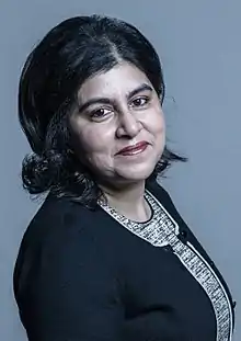 Sayeeda Hussain Warsi, baronesa Warsi (Dewsbury, 28 de marzo de 1971) es una abogada, política y miembro de la Cámara de los Lores británica. De 2010 a 2012 fue copresidenta del Partido Conservador. Fue parte del primer gabinete de David Cameron, primero como ministra sin cartera entre 2010 y 2012, luego como ministra de Estado para el Ministerio de Relaciones Exteriores y de la Mancomunidad de Naciones y como Ministra de Estado para la Fe y las Comunidades, hasta su dimisión citando su desacuerdo con la política del gobierno británico con respecto al conflicto entre la Franja de Gaza e Israel de 2014.[1]