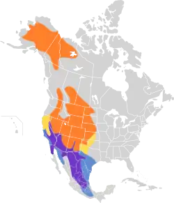 Se puede encontrar durante todo el año desde el oeste de Colorado hasta el sur de California, y desde el este de la península occidental de Texas hasta el oeste de México. Se reproducen desde Alaska, el oeste y el centro sur de Canadá, través de Dakota del Norte, el Medio Oeste y Nuevo México. En el invierno migra a zonas desérticas de Texas a través de México hasta el norte de América Central. Durante la migración de estas aves pueden encontrarse a miles de kilómetros fuera de su rango. Estas aves prefieren paisajes secos, desolados y áridos. Se pueden encontrar en bosques, tierras de cultivo y sabanas, generalmente cerca del agua.