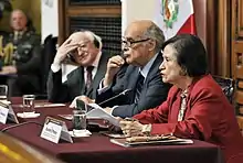 ![]() Con el Presidente de Irlanda Michael D. Higgins y el Canciller del Perú Ricardo Luna Mendoza, en una conferencia realizada en el Palacio de Torre Tagle, Lima. | ||