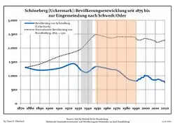 - Tendencia poblacional desde 1875 (línea azul: población; línea punteada: comparación con tendencias poblacionales del estado de Brandenburg; fondo gris: tiempo de gobierno Nazi; fondo rojo: tiempo de Gobierno comunista)