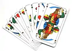 Se juega con una baraja diferente a la española y a la francesa que se relaciona tanto con el juego de Schafkopf que se identifica con él . Los palos son cuatro y tienen el orden de victoria siguiente en el juego, de mayor a menor: