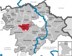 Se encuentra ubicada al norte del estado, en la región de Alta Franconia, a poca distancia de la frontera con los estado de Turingia y Sajonia.