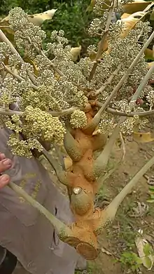 Florece a lo largo del año, produciendo ramilletes en forma de umbelas paniculadas laterales, de 20 a 60 cm de longitud. Los floros son numerosos, ubicados al cabo de talluelos florales, pardogrisáceos y pentámeros, con un diminuto hipantio en el que se aloja el ovario inferior; son pentámeras, de pétalos blancos, de un par de milímetros de largo, con cinco estámenes y dos estilos. El fruto es una baya carnosa, de color grisáceo, de unos 5 a 10 mm de largo y un poco más de ancho, que contiene dos semillas planas y oblongas, de dispersión zoocórica.