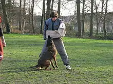 Actor indispensable en la defensa, este individuo generalmente ha sido capacitado para probar la calidad del ejemplar. Dentro de su equipo está una manga acolchada (para evitar daños debidos a los mordiscos del perro) y un bastón acolchado (para amenazar y dado el caso golpear al perro para probar su coraje).