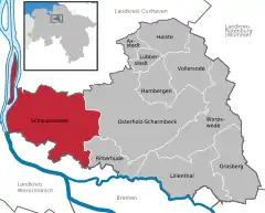 Se encuentra ubicado a poca distancia al noroeste de la ciudad de Bremen, a la orilla derecha del curso bajo del río Weser.