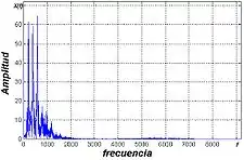 Se realiza el estudio de la señal de voz en el dominio de la frecuencia, con la finalidad de conocer sus características espectrales. Se muestra el espectro de una señal de voz correspondiente a la palabra 'Dos'.
