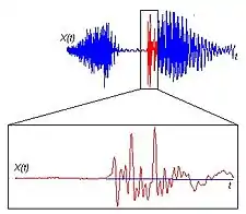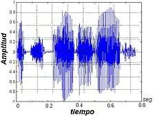 La señal de voz está constituida por un conjunto de sonidos generados por el aparato fonador. Esta señal acústica puede ser transformada por un micrófono en una señal eléctrica. La señal de voz en el tiempo puede ser representada en un par de ejes cartesianos. Como todo los sonidos, está formado esencialmente por curvas elementales (senos y cosenos) pero las posibles combinaciones de éstas pueden ser complejas. A manera de ejemplo, se muestra la forma de onda de la palabra ‘explorador’ (Imagen extraída de [Peralta, Cotrina. 2002]). La representación de la señal de voz en función del tiempo es importante puesto que brinda información sobre características importantes como la energía y los cruces por cero, las cuales facilitan su estudio y análisis.
