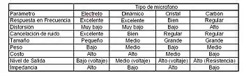 La calidad del micrófono probablemente es, el factor que más influye en la adquisición electrónica de señales del habla es el tipo de micrófono que se está usando. Existen, principalmente, cuatro tipos de micrófonos disponibles en el mercado, los cuales son el electreto, el dinámico, el de cristal y el de carbón. Para percibir fácilmente las diferencias entre estos tipos de micrófonos, sus características principales son comparadas en la siguiente tabla.