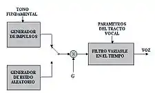 El tracto vocal se comporta como un filtro, cuyos parámetros varían en el tiempo en función de la acción consciente que se realiza al pronunciar una palabra. Se muestra el diagrama de bloques del modelo del tracto vocal. Se consideran dos posibles entradas que dependerán del tipo de señal a reproducir, sonora o no sonora. Para señales sonoras, la excitación será un tren de impulsos de frecuencia controlada, mientras que para las señales no sonoras la excitación será ruido aleatorio. La combinación de estas señales modela el funcionamiento de la glotis. El espectro de frecuencias de la Señal de Voz puede obtenerse a partir del producto del espectro de la excitación por la respuesta en frecuencia del filtro.