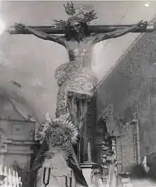 El templo que albergó al cristo por primera vez era sencillo, de adobe y madera. Cuatro siglos más tarde, en 1918, un 23 de junio, un severo incendio lo destruyó, dañando seriamente a la imagen. El fuego respetó el tronco de Cristo, mas no la cabeza y las extremidades, que se quemaron. Repuestos del dolor causado por la pérdida, los iqueños encargaron a sus mejores artistas la restauración de la imagen.
