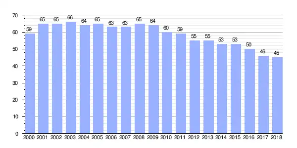 Gráfica de evolución demográfica de Seares de Arriba entre 2000 y 2018 |