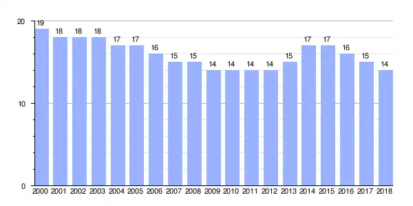 Gráfica de evolución demográfica de Sebio entre 2000 y 2018 |