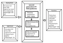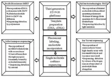La secuenciación del genoma del cáncer utiliza la misma tecnología que la secuenciación del genoma completo. La historia de la secuenciación ha recorrido un largo camino, originado en 1977 por dos grupos independientes: la técnica de secuenciación enzimática del ADN didoxilado de Fredrick Sanger[26] y la técnica de degradación química de Allen Maxam y Walter Gilbert.[27] Después de estos artículos de referencia, más de 20 años más tarde nació la "segunda generación" de secuenciación de alto rendimiento (HT-NGS), seguida de la "tercera generación de tecnología HT-NGS" en 2010.[28] Las figuras de la derecha ilustran el proceso biológico general y las empresas que participan en la secuenciación HT-NGS de segunda y tercera generación.