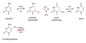 La 5-hidroximetilcitosina es una modificación de este nucleótido que ha sido descubierta recientemente y cuyo origen es diferente al de la 5-metilcitosina producida en la metilación del ADN. Cuando es tratado con bisulfito, este nucleótido se convierte en citosina-5-metilsulfonato, que es interpretado como citosina durante la secuenciación.[14] Por lo tanto la secuenciación con bisulfito no puede diferenciar entre 5-metilcitosina y 5-hidroximetilcitosina y la información que proporciona este método no puede ser definida únicamente como metilación del ADN.