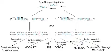 Se determinan las citosinas resistentes a la conversión por bisulfito mediante PCR y una secuenciación con didesoxinucleótidos. [6] Los cebadores se diseñan para ser específicos de la muestra y para que flanqueen los sitios de metilación de interés. Estos cebadores permitirán la amplificación de secuencias metiladas y no metiladas. En las moléculas amplificadas, los sitios que hayan sufrido conversión por bisulfito aparecerán como timinas en la cadena sentido y adenina en la antisentido por ser el nucleótido complementario a uracilo.
