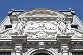 El frontón, esculpido por Camille Lefèvre, es una alegoría de las actividades bancarias : representa al Banco distribuyendo créditos, rodeado por el Comercio y la Industria, luego por el Ródano y el Sena. Está sostenido por cuatro cariátides dispuestas alrededor del gran reloj que simboliza las Horas del día. Son del estilo de las estatuas del Pavillon de l'Horloge.