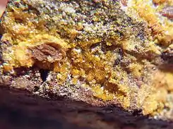 Es un mineral de color amarillo, que se encuentra como agregados de cristales formando placas.[1] Es muy similar a la schwartzembergita, tanto químicamente como físicamente, llegando a ser diferenciable solo con un análisis químico o de rayos X.[1]