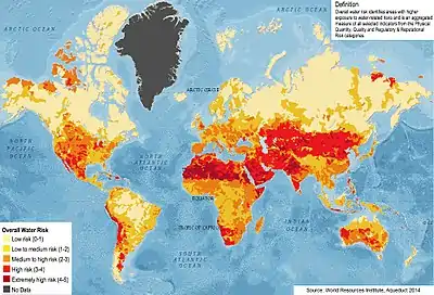 El agua, en términos absolutos, no escasea en todo el planeta. Pero, según la organización del agua de las Naciones Unidas, ONU-Agua, el suministro total de agua dulce utilizable para los ecosistemas y los seres humanos es de solo 200.000. km 3 de agua: menos del uno por ciento (<1%) de todos los recursos de agua dulce. El agua dulce utilizable incluye el agua no contaminada o degradada por productos químicos que alteran el agua, como las aguas residuales o cualquier otro producto químico nocivo de uso previo continuo.[12] En el siglo XX, el uso del agua ha crecido a más del doble de la tasa de aumento de la población. Específicamente, se prevé que las extracciones de agua aumenten en un 50 por ciento para 2025 en los países en desarrollo y en un 18 por ciento en los países desarrollados.[13] Se ha pronosticado que África tendrá entre 75 y 250 millones de habitantes sin acceso a agua potable.[14] Para 2025, 1.800 millones de personas vivirán en países o regiones con escasez absoluta de agua, y dos tercios de la población mundial podrían estar en condiciones de estrés hídrico.[15] Para el 2050, más de la mitad de la población mundial vivirá en áreas con escasez de agua, y otros mil millones podrían carecer de agua suficiente, según investigadores del MIT. [16]