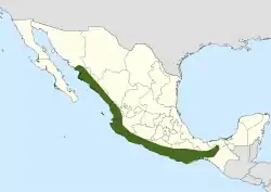 Endémica de los estados de Chiapas, Colima, Guerrero, Jalisco, Michoacán, Nayarit, Oaxaca, Puebla, Sinaloa, Sonora y Tabasco en México.[1]