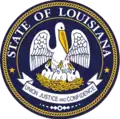 El gran sello del estado de Luisiana fue adoptado como sello oficial del estado en 1902. El escudo muestra una pelícano madre blanco (el ave oficial del estado) atendiendo a tres crías en su nido. En representaciones más detalladas la madre pelícano es mostrada desgarrando carne de su pecho a fin de alimentar sus crías. Aunque esto puede parecer un ejemplo exagerado de devoción en la crianza, esta es una práctica típica de las madres pelícano en circunstancias extremas. Aunque el número de crías ha variado a través de los años, desde la representación actual de tres hasta no menos de doce, la premisa y el diseño general han permanecido intactos. El lema del estado de Luisiana, "Union, Justice, Confidence" ("Unión, Justicia, Confianza") rodea a los pájaros en el escudo actual.