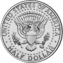 - en el reverso de la moneda de medio dólar de Kennedy (rodeado por "los Estados Unidos de América" en la parte superior y "medio dólar" en la parte inferior). Para el bicentenario de los Estados Unidos, se utilizó una representación del Independence Hall en el reverso de la moneda. El sello regresó a partir de 1977;