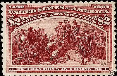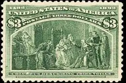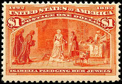 El diseño está basado en un cuadro de Antonio Muñoz Degrain y se titula Isabel cede sus joyas.[12] El diseño fue grabado por Robert Savage. Ningún sello de los Estados Unidos había tenido un precio de más de 90 ¢. Este sello, al igual que otros de mayor precio, no corresponden a ninguna tarifa concreta. Aunque este y los otros cuatro más caros se conoce que eran usados sobre todo para envíos pesados internacionales, existe la consideración de que fueron realizados simplemente para publicitar la Exposición Mundial Colombina de Chicago y para que el Departamento de la Oficina de Correos generase más ingresos. La mayor parte de los sellos de un dólar o más de esta serie están en cubiertas filatélicas.[8]
