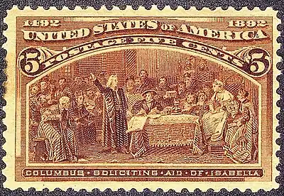 Se titula Colón solicitando ayuda a Isabel. Fue diseñado por Alfred Major, basándose en el cuadro Colón en la Corte de Fernando e Isabel de Václav Brožík de 1884. Este valor se utilizó principalmente para pagar la tarifa internacional de media onza de la Unión Postal Universal.[8]
