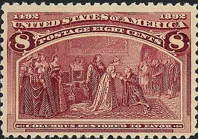 Cuando se emitió, solo había 15 en esta serie. Sin embargo, cuando la tarifa del correo certificado se redujo el 1 de enero de 1893, fue necesario emitir sellos de 8 centavos. El diseño se basa en el cuadro de Colón recupera el favor, realizado por Francisco Jover Casanova, y se agregó a la serie colombina en marzo.[8]
