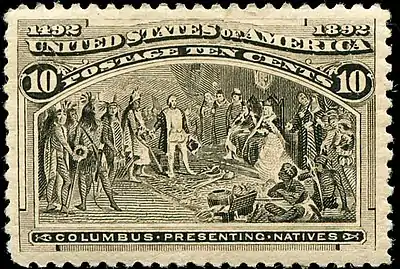 El diseño se titula, Colón presentándose ante los nativos. Está basado en un cuadro de Luigi Gregori para el edificio administrativo de la Universidad de Notre Dame tras su reconstrucción después del incendio de 1879. Fue una de los cinco diseños de la serie grabados por Robert Savage. Este sello servía para pagar la tarifa del correo certificado. No obstante, la reducción de la tarifa del correo certificado hizo necesaria la creación del sello de 8 ¢. Esto hizo que el sello de 10 ¢ sirviese para pagar tarifas adicionales.[8]