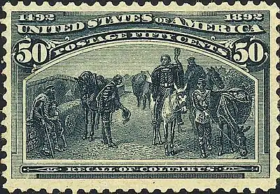El diseño está basado en un cuadro llamado Recuerdo de Colón, de A. G. Heaton.[12] Fue el primer sello de 50 ¢ de los Estados Unidos. Al igual que el resto de sellos de mayor coste de la serie, se usó sobre todo junto con otros para envíos más pesados o envíos internacionales.[8]