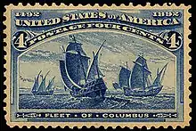 Se titula Flota de Colón. Existe cierta controversia sobre el origen del diseño. Al igual que el sello de 3 ¢, se cree que proviene de un grabado español desconocido. No obstante, aparece una imagen similar en un libro estadounidense unos seis meses anterior a la Exposición Mundial Colombina. Aunque tiene diferencias significativas, los autores de temas de filatelia que han investigado el asunto dicen que no se puede determinar el origen del diseño con la información que existe sobre él. El sello tiene el precio del correo de primera clase con el doble de peso.[8]