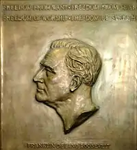 La obra de Burke llamada "Franklin Delano Roosevelt y las cuatro libertades" fue seleccionada como el trabajo ganador en una competencia nacional premiada por la Comisión de Bellas Artes.[9] Completado en 1944 (luego del fallecimiento de Roosevelt) la placa de bronce de 3,5 por 2,5 metros fue presentada ante el presidente Harry S. Truman el 24 de septiembre de 1945 en el Registro de Contratos de construcción en Washington, DC, donde todavía permanece hoy.[10] Esta placa sirvió de inspiración a John R. Sinnock "para su diseño del anverso de la moneda de diez centavos de Roosevelt".[5] La Administración Nacional de Archivos y Registros de la Biblioteca Franklin D. Roosevelt en Hyde Park, Nueva York, declaró que el retrato de diez centavos se originó con la escultura de Franklin Delano Roosevelt realizada por Selma Burke.[8] Selma Burke nunca ha recibido el crédito adecuado por el retrato.[11]