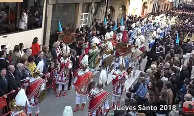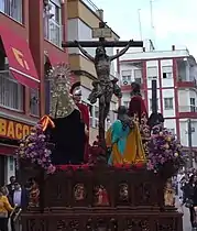 - Cofradía de la Cruz: la imagen de San Juan pertenecía a la Cofradía de Jesús Nazareno y en 1970 se separa y funda la cofradía, incorporando la imagen de la Virgen de la Cruz. En cuanto a las tallas, la de San Juan Evangelista es anónima y se realizó a finales del siglo XVII, siendo restaurada en 2009 por José Francisco Blasco Rivero. La Virgen se realizó en 1984 por Francisco Palos Chaparro y fue restaurada por José Francisco Blasco Rivero en 2010. El "paso" procesiona tanto a motor como a bastoneros, pues por desgracia hay años en los que no hay suficientes bastoneros. Los nazarenos visten túnica blanca con antifaz y cinturón verde. Actualmente podemos encontrar las imágenes en la Parroquia de Nuestra Padre Jesús Nazareno.