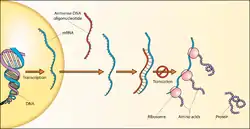 Las moléculas de ácido nucleico antisentido se han utilizado experimentalmente para unirse al ARNm y evitar la expresión de genes específicos. Las terapias antisentido también están en desarrollo; en los EE. UU., la Administración de Alimentos y Medicamentos (FDA) ha aprobado los oligos fomivirsen (Vitravene) y mipomersen (Kynamro) [5] antisentido de fosforotioato para uso terapéutico en humanos.