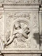 Este arcosolio lo sostienen unas cariátides junto con unas pilastras de estilo jónico decoradas con atributos militares entre las que están colocadas dos figuras femeninas simbolizando la Paz. Por encima de la figura del yacente se encuentra la representación en un alto relieve del Entierro de Cristo. En la imposta dentro de unos grandes medallones hay unas figuras ofreciendo al difunto una corona y una palma que significan la Gloria y la Fama.[2] En el friso superior se pueden ver escenas de marchas de tropas y otras historias militares. Una gran cornisa, decorada con gran detalle, sostiene en el centro la imagen de una Virgen con Niño rodeada de dos ángeles con las alas extendidas. En ambos lados se encuentran unas estatuas sentadas. Debajo de la imagen de la Virgen, se puede ver el escudo de armas y la inscripción: