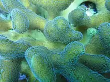 Los pólipos contienen algas simbióticas llamadas zooxantelas. Las algas realizan la fotosíntesis produciendo oxígeno y azúcares, que son aprovechados por los pólipos, y se alimentan de los catabolitos del coral (especialmente fósforo y nitrógeno).[4] Esto les proporciona entre el 75 y el 95% de sus necesidades alimenticias. El resto lo obtienen atrapando plancton microscópico y materia orgánica disuelta en el agua.
