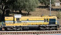 Locomotora número 1417 de la Somafel, que antes ostentaba el número 1525 de la operadora Caminhos de Ferro Portugueses, en la Estación de Alcácer do Sal.