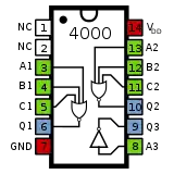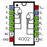 4002 - Dos puertas NOR de cuatro entradas (Dual 4-input NOR gate)![]() Distribución de pines 4002 |