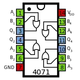 4071 - Cuatro puertas OR de dos entradas (Quad 2-input OR gate)![]() Distribución de pines 4071 |