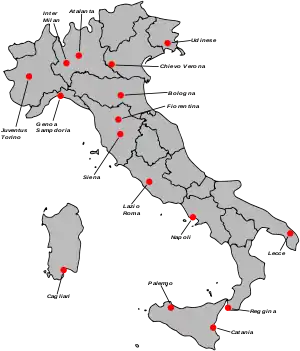 Seis equipos provienen del sur: Cagliari, Catania, Lecce, Napoli, Palermo y Reggina.