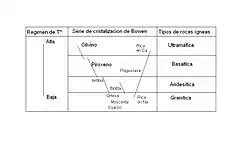 El primer factor fue estudiado por Bowen, que observó que la cristalización de los minerales durante el enfriamiento de un magma sigue, en términos generales, una secuencia determinada, que se puede subdividir en dos grandes ramas: la denominada rama discontinua (minerales ferromagnesianos), y la rama continua (plagioclasas), que convergen en un tronco común, que corresponde a la cristalización de feldespato potásico y finalmente cuarzo, siempre los últimos en cristalizar.