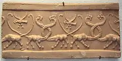 La imagen se ha encontrado específicamente en decorados de paletas para cosméticos que datan desde el Periodo predinástico de Egipto y más comúnmente como parte de los motivos grabados en los sellos cilíndricos del Período de Uruk (alrededor de 3500-3000 a. C.). Entre los ejemplos se encuentran la paleta de Narmer y la pequeña paleta de Hieracómpolis. En el sello cilindro de la derecha se observa claramente el motivo, que generalmente consiste en dos criaturas con los cuellos entrelazados.