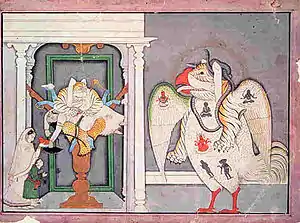 Algunas escrituras regionales del sur de la India narran que Narasimha tomó la forma de Gandaberunda (literalmente "el poderoso bicéfalo "), un ave-animal de dos cabezas más feroz, que combate y destruye Shiva-Sharabha.[18][27]
