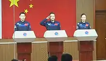 ![]() Экипаж «Шэньчжоу-13», слева направо: Е Гуанфу, Чжай Чжиган, Ван Япин ![]() Ye Guangfu, Zhai Zhigang y Wang Yaping | ||