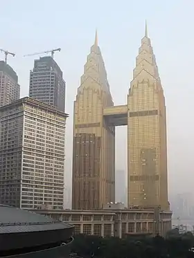 Las dos torres gemelas están cubiertas con cristal dorado y rematadas con una corona y aguja decorativa, también de color dorado. Están conectadas mediante un pasadizo elevado a una altura intermedia.