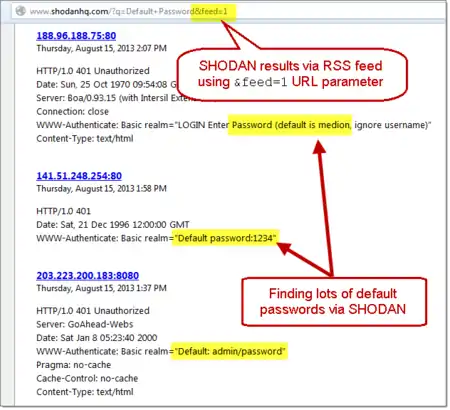 Las herramientas defensivas libres de Bishop Fox incorporan datos de SHODAN en sus alertas defensivas utilizando esta funcionalidad para convertir los resultados de las búsquedas de SHODAN en RSS mediante la concatenación de &feed=1 a las URL de búsqueda normales de SHODAN. Por ejemplo: http://www.shodanhq.com/?q=Default+Password&feed=1