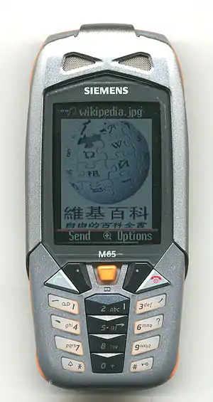 - Pantalla : TFT 132 x 176 pixels a 65536 colores. Los Siemens CX65, Siemens M65, Siemens S65 y Siemens SK65 tienen una resolución de 132x176 píxels con una profundidad de color de 16 bits basado en 3 chips diferentes:[2][3][4][5]