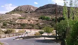 En la base de la ladera occidental, hay un camino rural en el cual hay situadas muchas casas de campo y de segunda residencia. Más abajo, en el paraje de La Jaud, la montaña genera un pequeño desfiladero en el que el río discurre paralelo y muy próximo a esta. Es una zona en la que existen yacimientos arqueológicos, posiblemente de época tanto romana como morisca. En su extremo sur se encuentra el Puente Sambo, que desde 1858 da paso al ferrocarril Madrid-Alicante. La ladera oriental es mucho más seca, y en ella se observan terrazas con cultivo de almendros, abandonados desde hace décadas y ya casi inexistentes. A los pies de esta ladera se encuentran los manantiales y baños de agua salada de Las Salinetas.